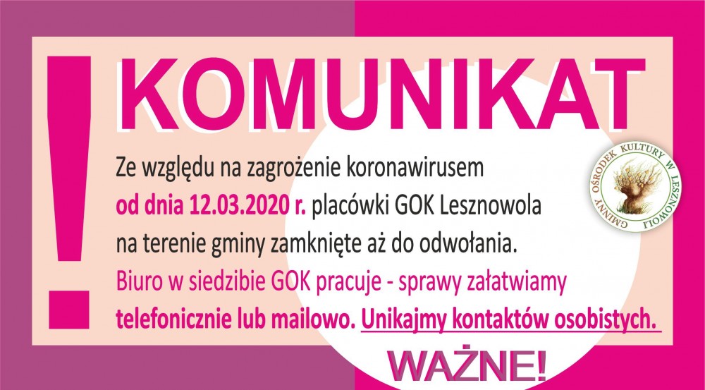 Ze względu na zagrożenie koronawirusem i w trosce o Państwa zdrowie od dnia 12.03.2020 r. zawiesza się wszystkie spotkania, imprezy, próby zespołów oraz zajęcia cykliczne dla dzieci, młodzieży, dorosłych oraz seniorów w Gminnym Ośrodku Kultury w Lesznowoli do co najmniej 29 marca br. lub w razie potrzeby aż do odwołania. Prosimy o śledzenie informacji.