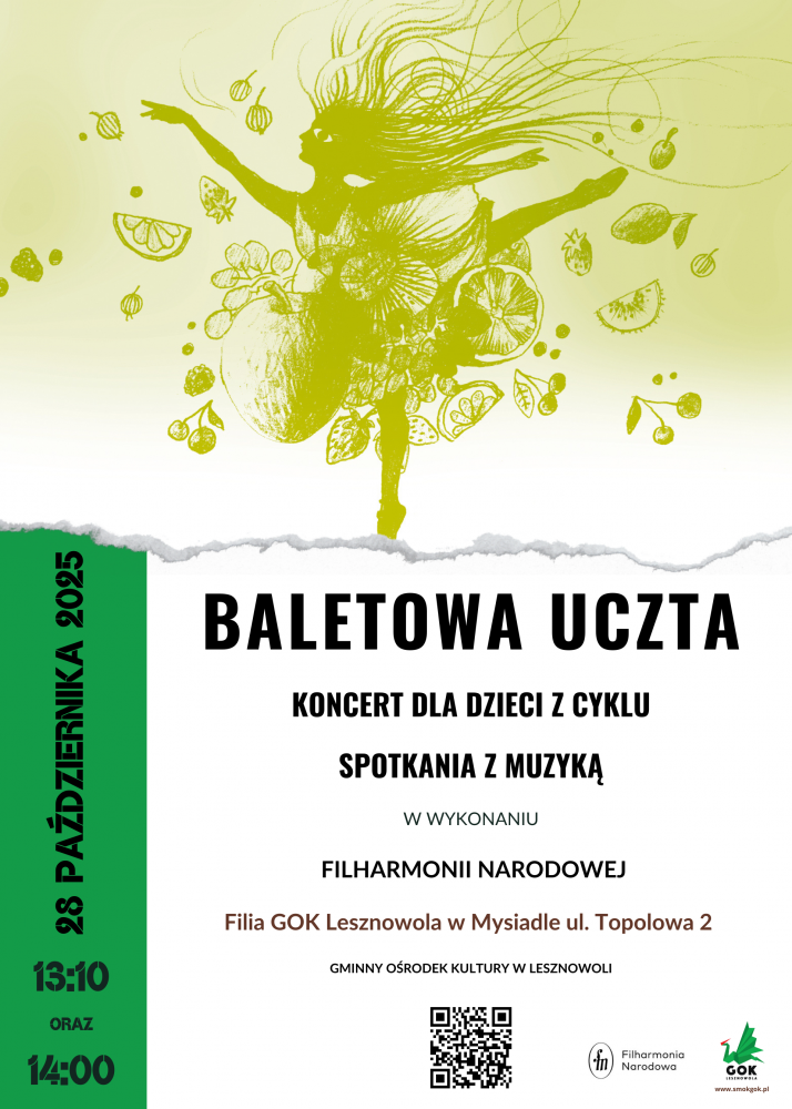Zapraszamy na koncert Baletowa uczta z cyklu "Spotkania z muzyką" w wykonaniu Filharmonii Narodowej. Wydarzenie odbędzie się 28 października 2025 w godz. 13.10 oraz 14.00 (2 grupy) w filii GOK Lesznowola w Mysiadle, ul. Topolowa 2
