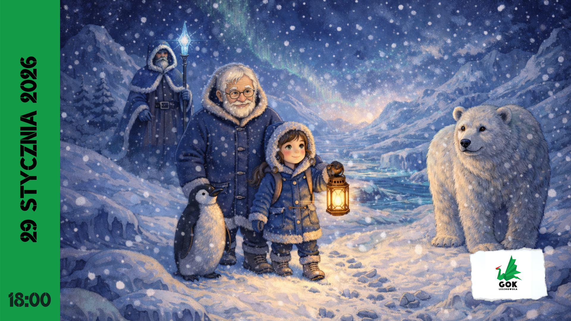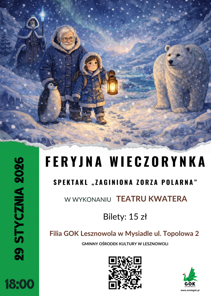 Spektakl „Zaginiona Zorza Polarna” to historia dziewczynki o imieniu Luna i jej dziadka, którzy marzą o tym, aby na własne oczy ujrzeć prawdziwą zorzę polarną. Długo wyczekiwany dzień kończy się wielkim rozczarowaniem, bowiem zorza polarna nie pojawia się na niebie.