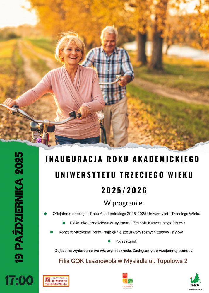 Wszystkich Seniorów, należących lub chcących przynależeć do Uniwersytety Trzeciego Wieku w Lesznowoli, zapraszamy na uroczystą Inaugurację nowego roku akademickiego 2025/2026.